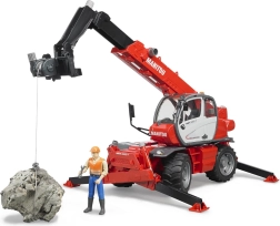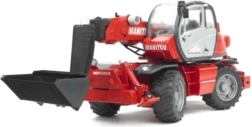 Gedetailleerd model van de telescooplader MANITOU MRT 2150 van het merk Bruder, ideaal voor jonge bouwers en verzamelaars. Voorzien van een 360° draaibare cabine, vierwielbesturing voor een kleine draaicirkel en verwisselbare aanbouwdelen (schep, vorken, palletkorf). De stabiliteit wordt gewaarborgd door vier telescopische steunpoten. Hoogwaardige afwerking van duurzaam kunststof, gemaakt in Duitsland.