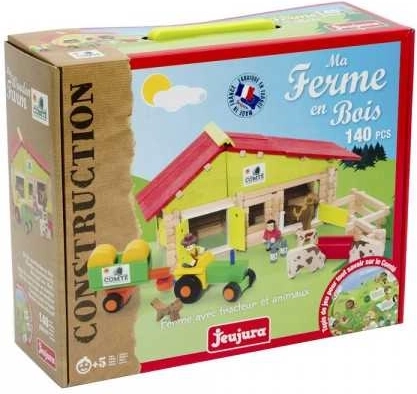Houten bouwset Jeujura met 140 onderdelen die de wereld van de boerderij aan jonge bouwers presenteert. Gemaakt van hoogwaardig massief hout in Frankrijk, met een praktische verpakking en eenvoudige handleiding voor kinderen vanaf 5 jaar.