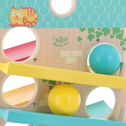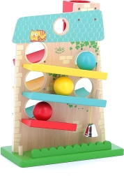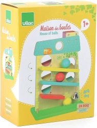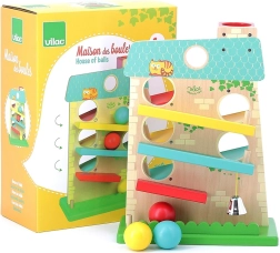 Het houten cascadehuisje van VILAC betovert kleine kinderen met het leuke rollen van de balletjes en het aantrekkelijke design. Het biedt 3 hellingen aan beide zijden waarover de houten balletjes van boven naar beneden rollen en bij de finish rinkelt een metalen belletje. Het speelgoed in pasteltinten ontwikkelt handigheid en logisch denken en zorgt voor uren speelplezier.