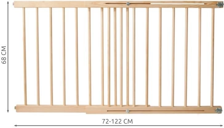 Dit universele hekje van hoogwaardig sparrenhout is ontworpen om ruimtes in huis veilig te scheiden. De breedte van 72–122 cm maakt montage in de meeste standaard doorgangen en op trappen mogelijk. Afgeronde randen en een nauwkeurig glad afgewerkt oppervlak verhogen de veiligheid en het comfort bij dagelijks gebruik.
