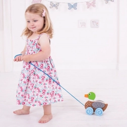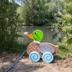 Bij het trekken waggelt de eend grappig en bewegen de vleugels. Gekleurde wielen met een spiraalpatroon trekken de aandacht van kinderen en moedigen hen aan tot nieuwe stapjes.