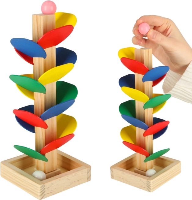 Ontdek de houten knikkerboom MONTESSORI – een speels leermiddel dat kinderen laat kennismaken met kleuren, geluiden en natuurkunde. Laat een knikker vanaf de top rollen en kijk hoe hij over de gekleurde blaadjes naar beneden glijdt, terwijl fijne motoriek en oog-handcoördinatie worden ontwikkeld. Gemaakt van natuurlijk hout, compacte hoogte 21 cm en een geweldig cadeau voor nieuwsgierige kinderen.