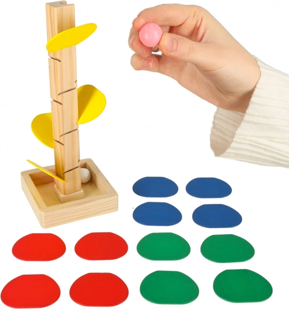 Gekleurde blaadjes en zachte geluiden bij de landing van de knikkers houden de aandacht van kinderen vast, ondersteunen concentratie en kleurwaarneming.