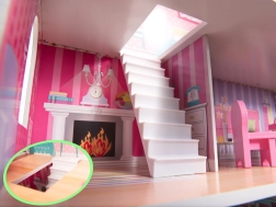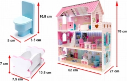 Dit ruime houten poppenhuis zal zowel kinderen als ouders aanspreken. Drie verdiepingen met een minimale verdiepingshoogte van 18 cm omvatten een keuken, badkamer, slaapkamer, woonkamer en trappen met balkonnetjes. Inclusief stijlvolle meubels van hout en kunststof en een zelfklevende LED-strip met koel wit licht – ideaal ook als zacht nachtlampje.