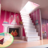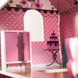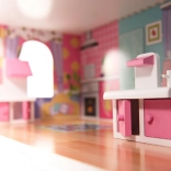 Het huis biedt drie niveaus met vijf kamers, trappen en balkonnetjes. Kleurrijke prints op muren en vloeren creëren een gezellige sfeer voor fantasierijk spel.