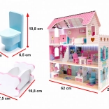 Groot houten poppenhuis van 70 cm hoog van MDF met drie verdiepingen, vijf kamers en een terras, een uitgebreide set meubels en sfeervolle LED-verlichting. Dankzij openende kastjes, zorgvuldige afwerking en veilig afgeronde elementen is het de ideale speelgoedkeuze voor creatief en fantasiespel en tevens een mooie decoratie voor de kinderkamer.