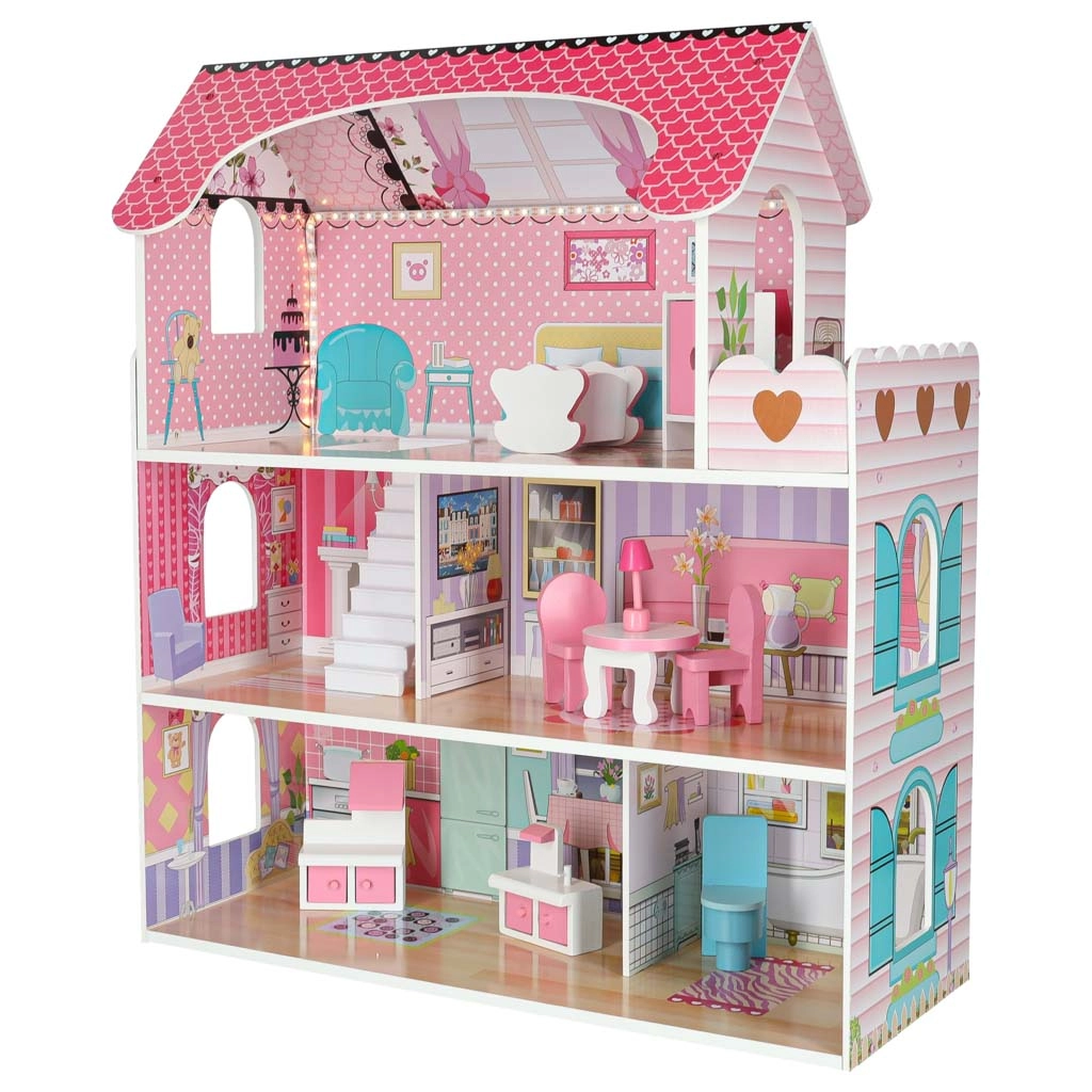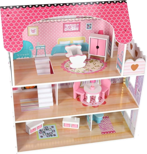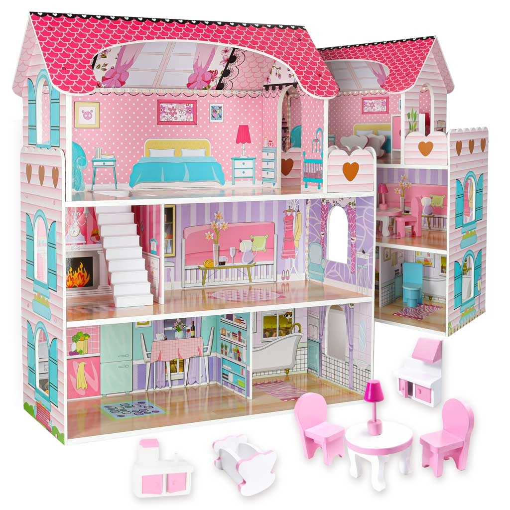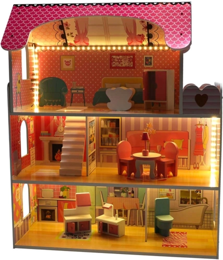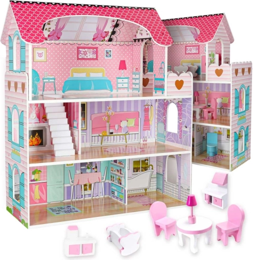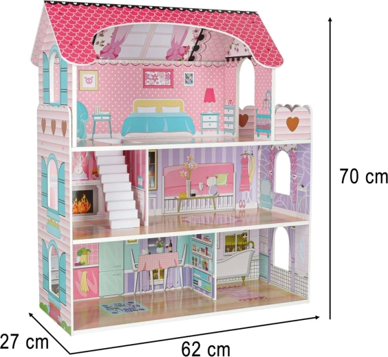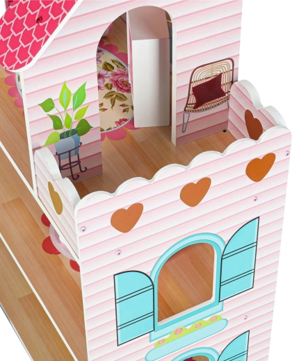 Het grote houten poppenhuis zal zowel kinderen als ouders bekoren. Drie ruime verdiepingen bieden een keuken, badkamer, slaapkamer, woonkamer en een trap met balkon. De rijke set houten accessoires en realistische muurprints stimuleren creatief rollenspel en de ontwikkeling van de fijne motoriek.