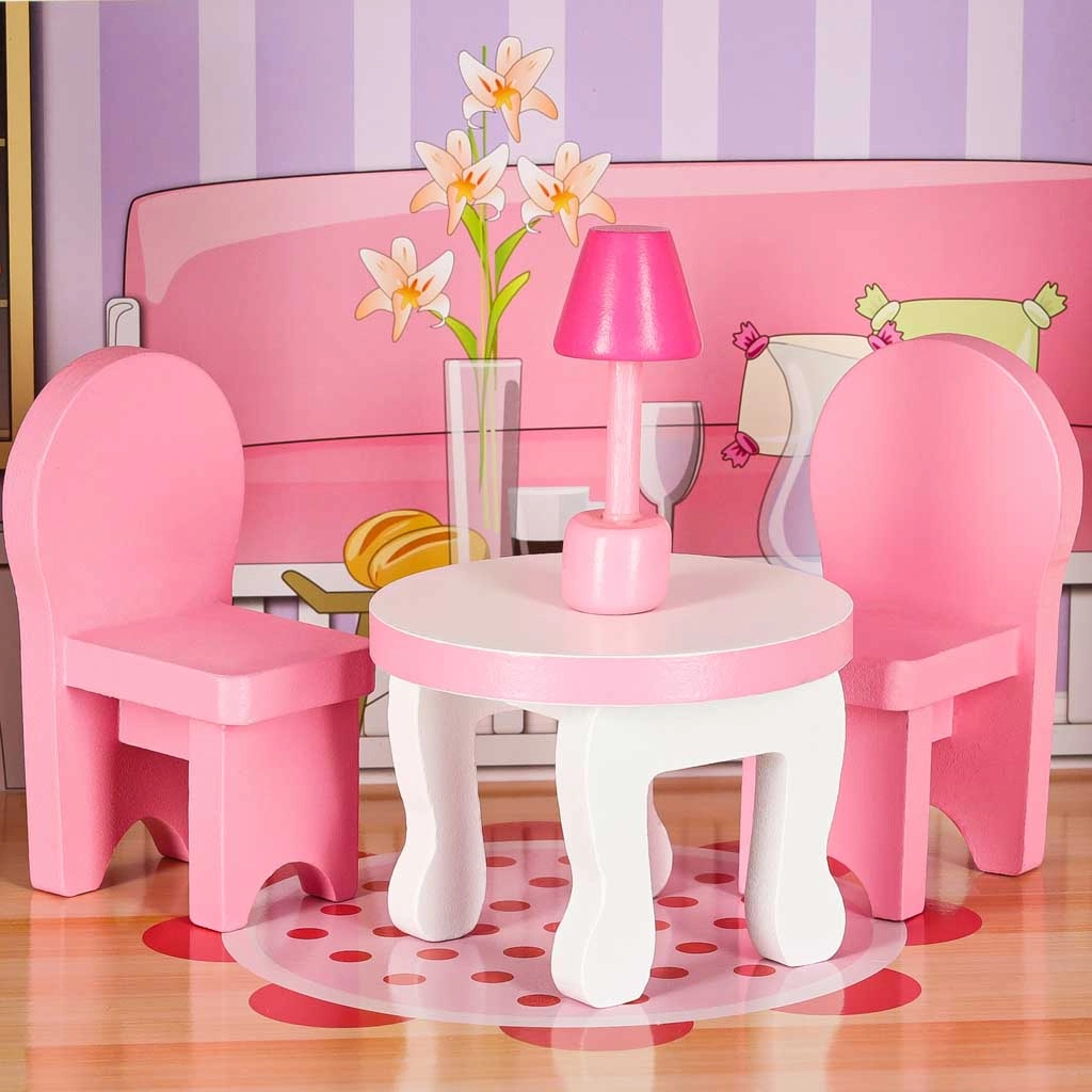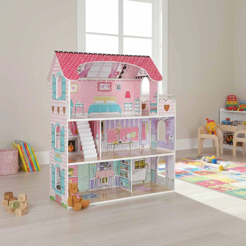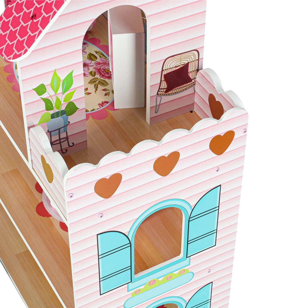 Het grote houten poppenhuis zal zowel kinderen als ouders bekoren. Drie ruime verdiepingen bieden een keuken, badkamer, slaapkamer, woonkamer en een trap met balkon. De rijke set houten accessoires en realistische muurprints stimuleren creatief rollenspel en de ontwikkeling van de fijne motoriek.