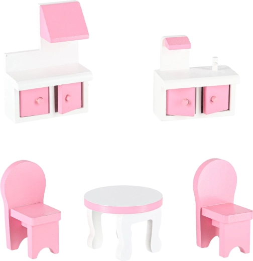 Inclusief kastjes met openslaande deurtjes, keukenblok, tafel en stoelen, wieg, lamp en toilet – alles van glad afgewerkt hout met fijne details.