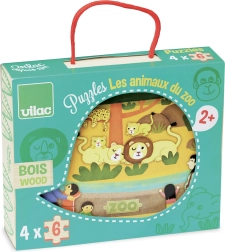Houten puzzels met ZOO-thema bieden plezier voor kinderen vanaf 2 jaar. Bevat vier puzzels, elk met zes stukjes, praktisch opgeborgen in een houten doos met katoenen handvat.