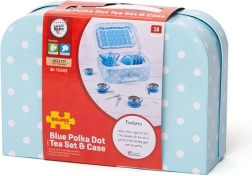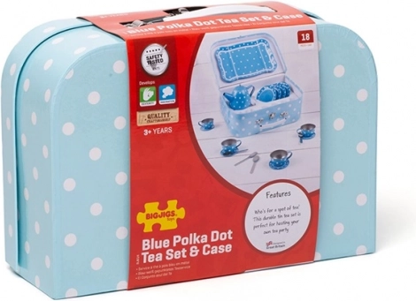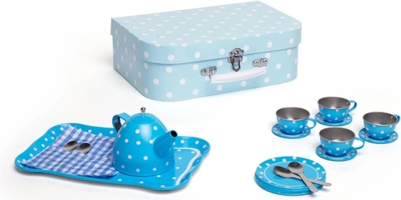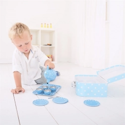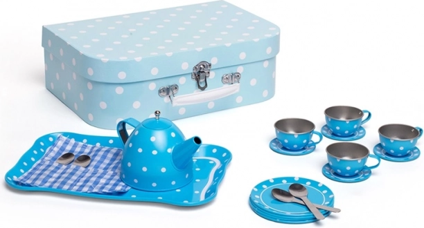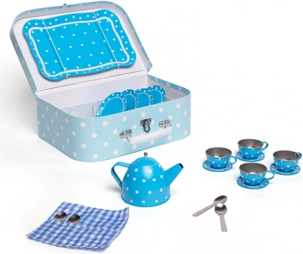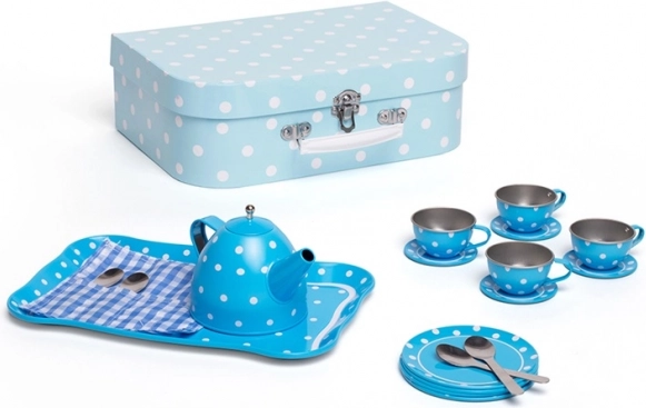 Stijlvolle blauwe theeset met stippen in een stevige koffer, perfect voor elke kleine gastheer of gastvrouw. Bevat alles voor de perfecte kinder-theepartijtjes – van theepot tot kopjes en schoteltjes. Dankzij de metalen uitvoering is de set duurzaam, gemakkelijk mee te nemen en ideaal voor op reis. Het spel stimuleert creativiteit, fantasie en sociale vaardigheden en voldoet aan de Europese veiligheidsnormen.