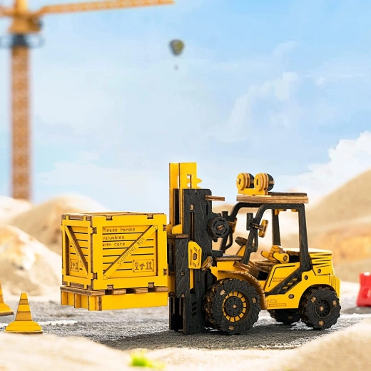 Breid de heftruck uit met andere houten modellen van bouwmachines en creëer je eigen collectie functionele machines.