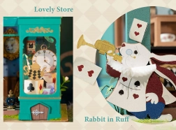 Ontdek een miniatuurwereld vol fantasie – een groen getinte theewinkel met motieven van het Witte Konijn, een zakhorloge en een schaakbordvloer schept de sfeer van een Europese afternoon tea. Wanneer je de LED-verlichting aandoet, verandert het model in een betoverende decoratie met een aangename avondambiance.