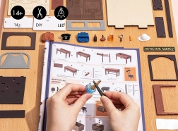 - Materiaal voor het poppenhuis, LED, lijm, plastic pincet, geïllustreerde handleiding (EN)