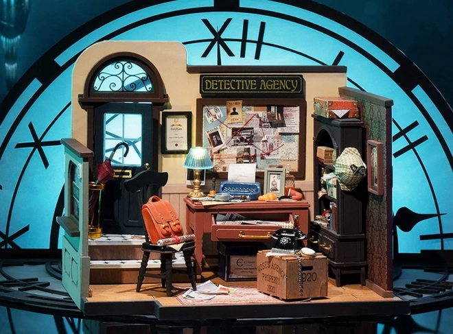 Typemachine, prikbord met aanwijzingen, telefoon en hoed – elk miniatuuritem creëert de sfeer van een Brits detectivebureau.