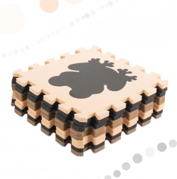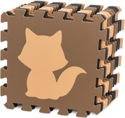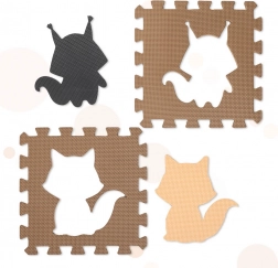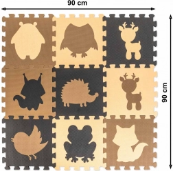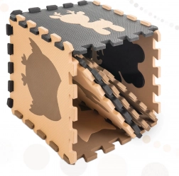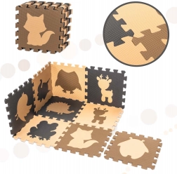 Zachte en veilige speelmat voor kinderen van duurzaam EVA-schuim in neutrale beige en bruine tinten. Set van 9 delen met uitneembare dierenvormen creëert een oppervlak van 85 × 85 cm en maakt ook het bouwen van 3D-vormen mogelijk. Isoleert tegen kou, dempt schokken, is waterbestendig en makkelijk te reinigen. Ideaal voor de eerste stapjes, spelen en het leren van vormen.