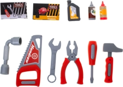 - Werkbank/koffer, 12 schroeven, 6 korte schroefjes, 6 moeren/opzetstukken, 4 spijkers, zaag, handzaag, 2 sleutels, schroevendraaier, hamertje, tang, verbindingsstukken, stickers