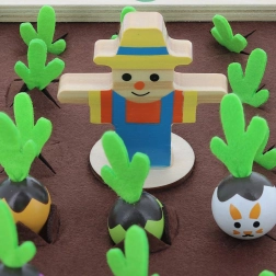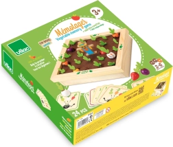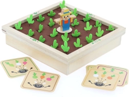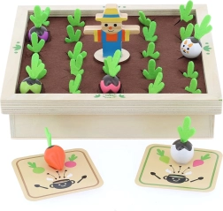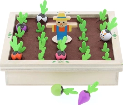 Ontdek de magie van de moestuin aan de familietafel. Dit prachtige houten spel met viltelementen brengt kleurrijke groentefiguurtjes en receptkaartjes, waarmee kinderen vormen, kleuren en logische verbanden leren herkennen. Speel klassiek memory of kook samen soep volgens de recepten – altijd met een vleugje spanning of het ondeugende konijn verschijnt.
