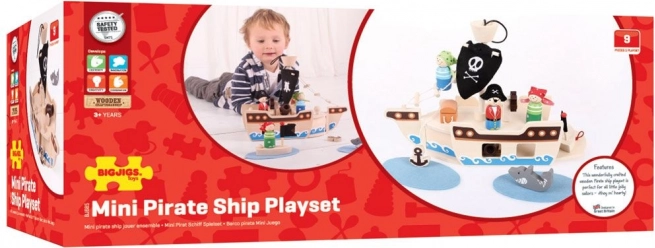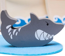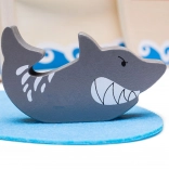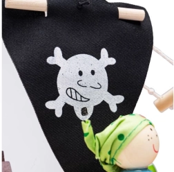 Deze houten piratenset bevat alles wat kleine piraten nodig hebben voor hun avonturen. De verpakking bevat een kapitein, twee piraten, een schip, een anker, een schatkist en een haai. Alle speelonderdelen kunnen praktisch in het schip worden geplaatst, waardoor het ideaal is voor reizen en eenvoudig mee te nemen.