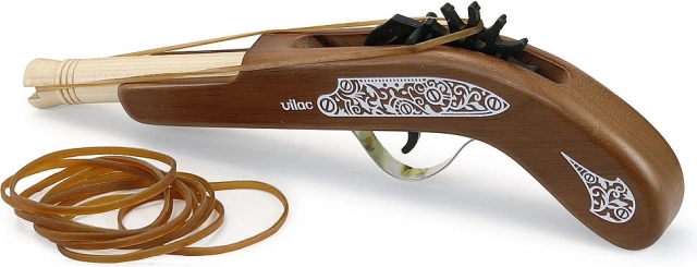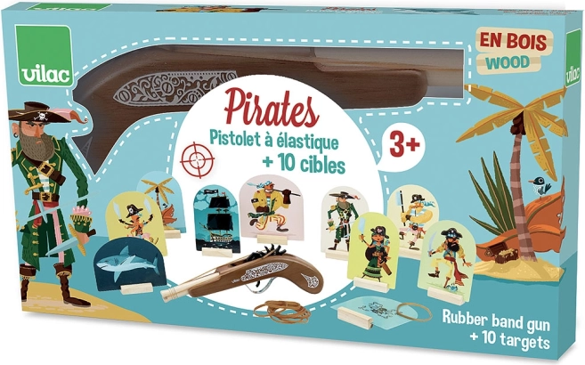 Houten piratenpistool van het merk Vilac is het ideale speelgoed voor kleine enthousiastelingen van piratenavonturen. Het stelt kinderen in staat om te oefenen met veilige elastiekjes, die bij de verpakking zijn inbegrepen.