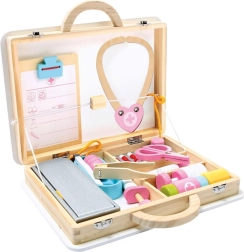 De set bevat houten hulpmiddelen zoals een stethoscoop, injectiespuit en andere benodigdheden die realistisch spel ondersteunen.