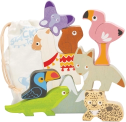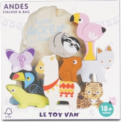 Deze Andes stapeltoren brengt het bergavontuur rechtstreeks naar de kinderkamer. De set bevat robuuste houten dierfiguren (bijv. lama, flamingo, toekan, hagedis, vlinder, luiaard) en een bergdeel die je kunt stapelen, balanceren en combineren tot speelse composities.
