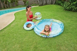 De set bevat een opblaasbaar zwembad, een zwemring en een strandbal – kinderen kunnen spetteren, de bal vangen en vertrouwen in het water opbouwen.