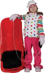 Verhoogde zijkanten, een gevormde zitting en zij-handremmen zorgen voor een zekere rit, ook op hardere sneeuw.