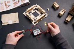 De set bevat 340 nauwkeurig uitgesneden houten onderdelen en een gedetailleerde handleiding. De montage is haalbaar voor handige beginners en biedt toch genoeg uitdaging voor gevorderden. De voeding kan optioneel via USB‑C of 3× AA (niet inbegrepen in de verpakking), zodat het model gemakkelijk in elke ruimte past.