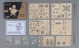De set bevat alles wat je nodig hebt: voorgestanste triplex onderdelen, stalen assen, een diode, een filmstrook en een geïllustreerde handleiding met QR-code naar de montagevideo. Het model is een geweldig cadeau en tevens een designdecoratie voor kantoor of woonkamer.