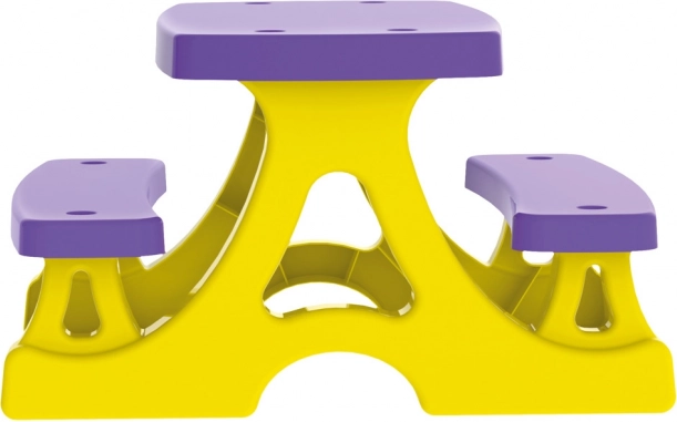 De set in een levendige geel‑paarse kleurcombinatie fleurt elke ruimte op en biedt een stabiele plek voor tussendoortjes, creatieve activiteiten en gezellige momenten samen.