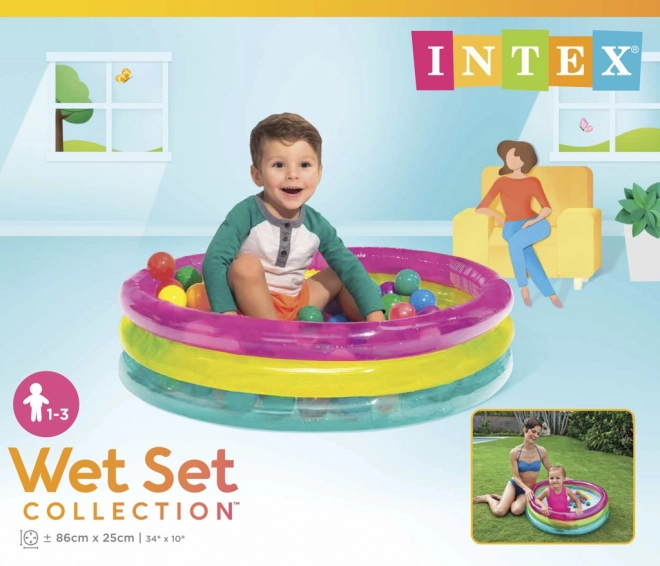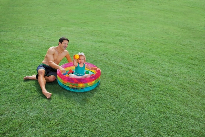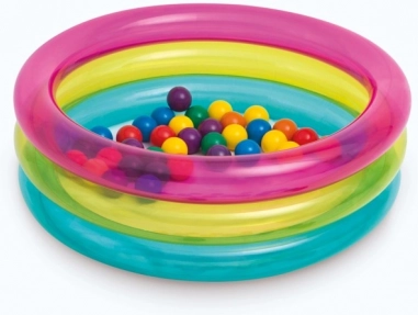 Een vrolijke opblaasbare ballenbak met ballen van INTEX verandert elke kinderkamer en tuin in een veilige speelplek. Transparante wanden met roze, gele en blauwe streep. Duurzaam PVC zorgt voor eenvoudig onderhoud en een lange levensduur, ideaal voor kinderen van 1–3 jaar.