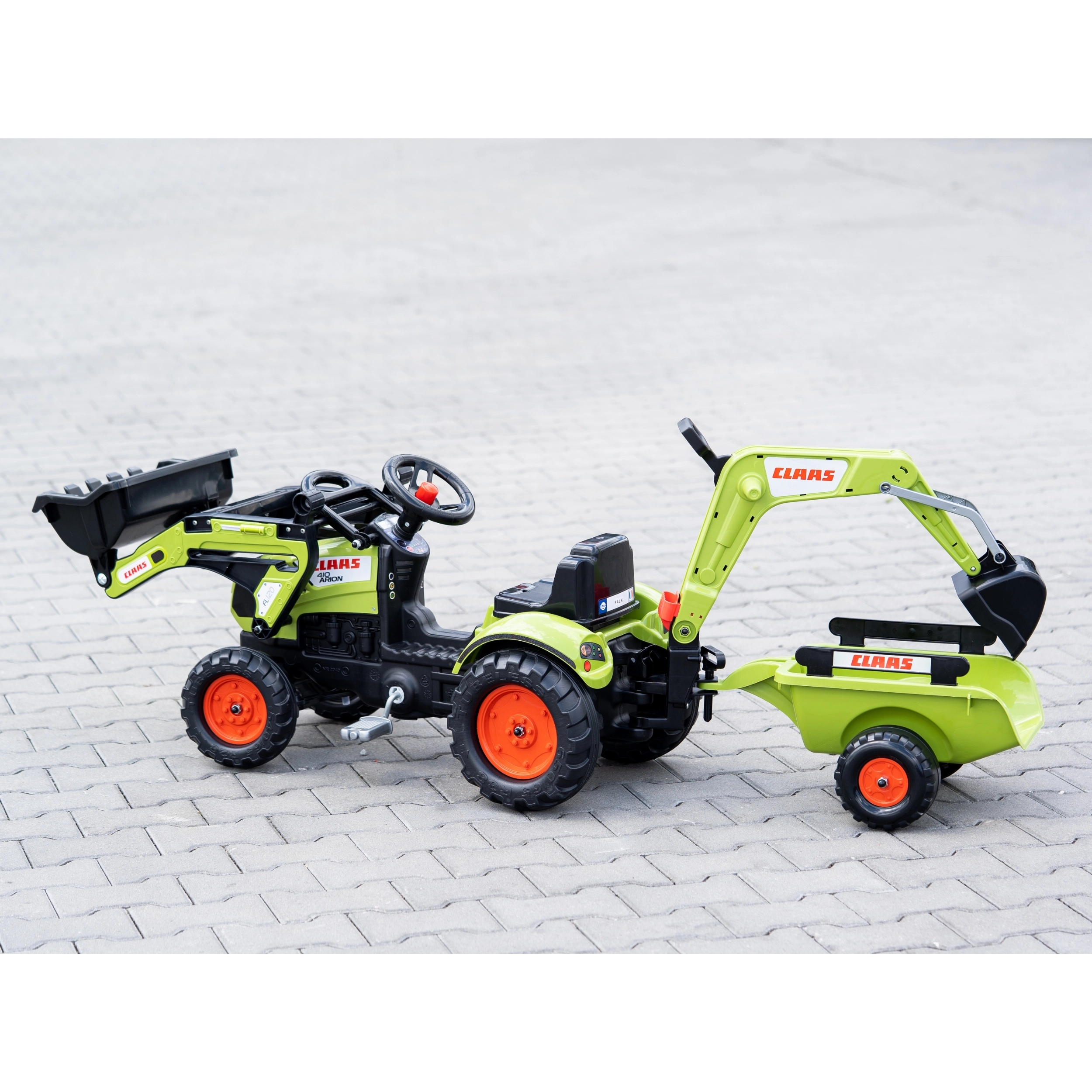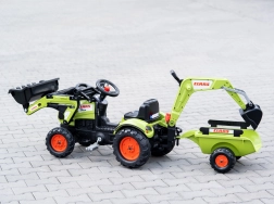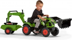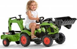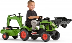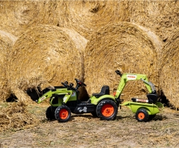 De tractor is uitgerust met kettingaandrijving op de achteras, een draaibare vooras voor gemakkelijk sturen en een afkoppelbare aanhanger voor het vervoeren van speelgoed of “lading”. De frontlader met bewegende bak maakt het mogelijk om zand, hooi en kleine tuindingen te scheppen – de perfecte partner voor buitenavonturen.