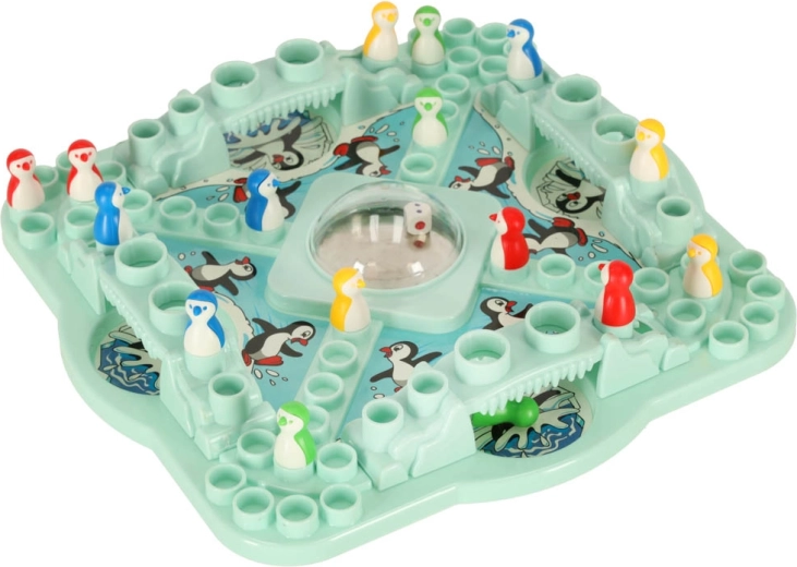 - speelbord met pop-up dobbelsteen, 16 pinguïnfiguren (4× blauw, 4× geel, 4× groen, 4× rood), 4 bruggen