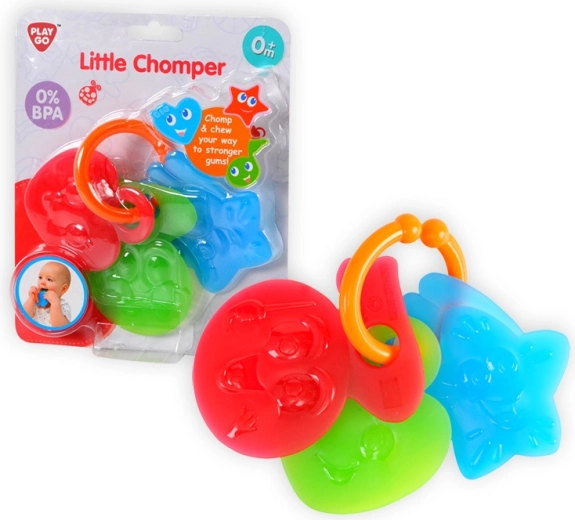 Bijtring en speeltje in één. Aan de ring, die je aan de kinderwagen kunt bevestigen, zitten 3 verschillende gekleurde bijtringen. Train je tandvlees en verlicht de pijn bij het doorkomen van de eerste tandjes.