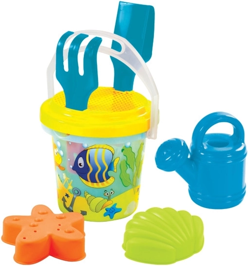 Vrolijke transparante zandset voor kinderen in drie motieven – feeën, dinosaurussen en visjes – brengt veel plezier op de zandbak en het strand. Bevat een emmer van 1,3 l, harkje, schepje, zeef, gietertje en twee zandvormpjes. Gemaakt in de EU van hoogwaardige kunststof.