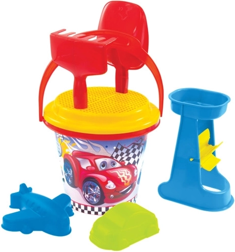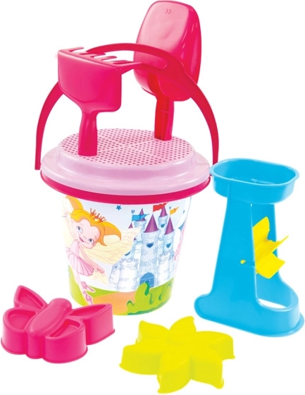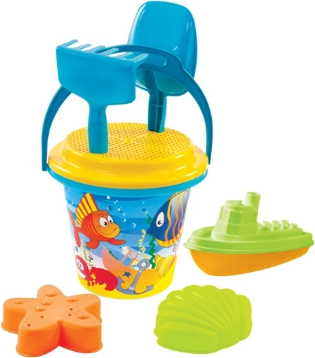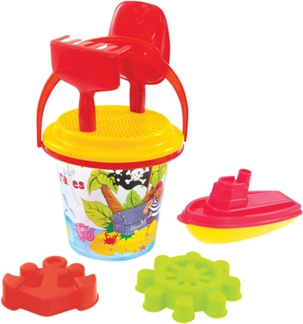 • Inhoud set: emmer 3,2 l, harkje, schepje, zeef, watermolen of bootje, 2 thematische zandvormpjes.
