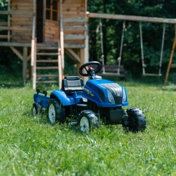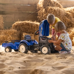 De traptractor, geïnspireerd op echte NEW HOLLAND-machines, geeft kinderen een realistische rijervaring. Dankzij de te openen motorkap met motorimitatie kunnen kleine bestuurders de “binnenkant” van de machine verkennen, terwijl de kettingaandrijving op de achteras voor een soepele rit zorgt. De afneembare aanhanger is ideaal voor het vervoeren van speelgoed of kleine ladingen in de tuin.