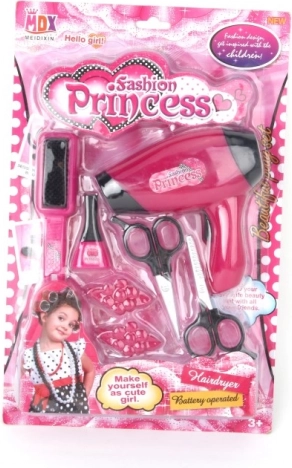 De set bevat veilige kunststof tools zoals een föhn, krultang, kam, speldjes en decoratieve accessoires. Dankzij het lichte ontwerp zijn ze eenvoudig te hanteren en perfect voor de ontwikkeling van de fijne motoriek.