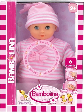 De Bambolina-pop is uitgerust met 6 geluiden, waardoor ze interactief en leuk is. Kinderen kunnen genieten van verschillende situaties en rollenspellen, waarbij de pop geluiden maakt die haar tot leven brengen. De verpakking bevat een assortiment van twee stijlen, zodat je kunt kiezen uit verschillende varianten. Bambolina is de perfecte speelkameraad voor dagelijks spel en de ontwikkeling van creativiteit.