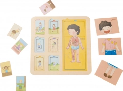 De houten puzzel van het menselijk lichaam van Classic World is het ideale speelgoed voor kinderen vanaf 12 maanden. Het bestaat uit een bord en 18 kleurrijke stukken die kinderen bij verschillende activiteiten voorstellen. Kinderen moeten de stukken op de juiste plaats leggen om een compleet plaatje te vormen.