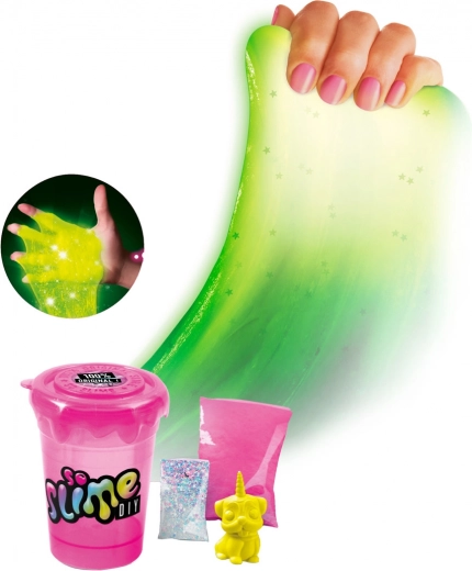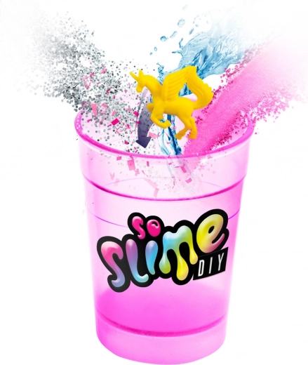 Maak je eigen slijm. Giet het poeder in het bekertje, voeg glitters en een figuurtje toe. Vul water tot aan het streepje, sluit het bekertje en schud het mengsel goed. Open vervolgens het bekertje en wacht vijf minuten. Het slijm is klaar. Combineer kleuren, voeg glitters toe en geniet van echte slijmpret. Licht op in het donker. Voor kinderen vanaf 6 jaar.