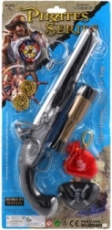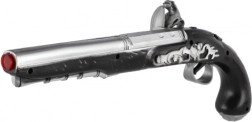 Decoratief speelgoedpistool met gravures en een zichtbare rode punt voor veilig spel geeft elke piratenmissie extra flair.