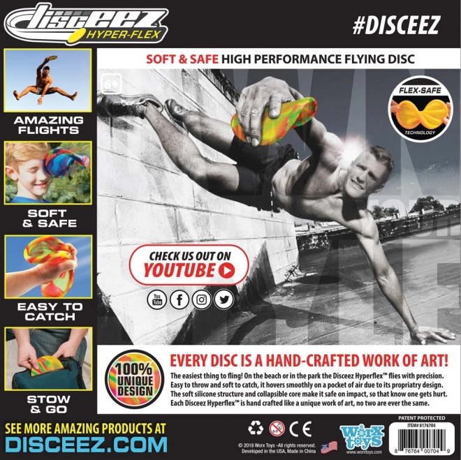 De DISCEEZ Hyper-Flex vliegende schijf met een diameter van 20,5 cm is ontworpen voor maximaal plezier en veiligheid. Hij is gemaakt van zacht, flexibel materiaal dat zorgt voor een stabiele vlucht en comfortabel vangen zonder pijnlijke klappen. Dankzij de aantrekkelijke patronen en kleuren zijn kinderen én volwassenen er meteen weg van.