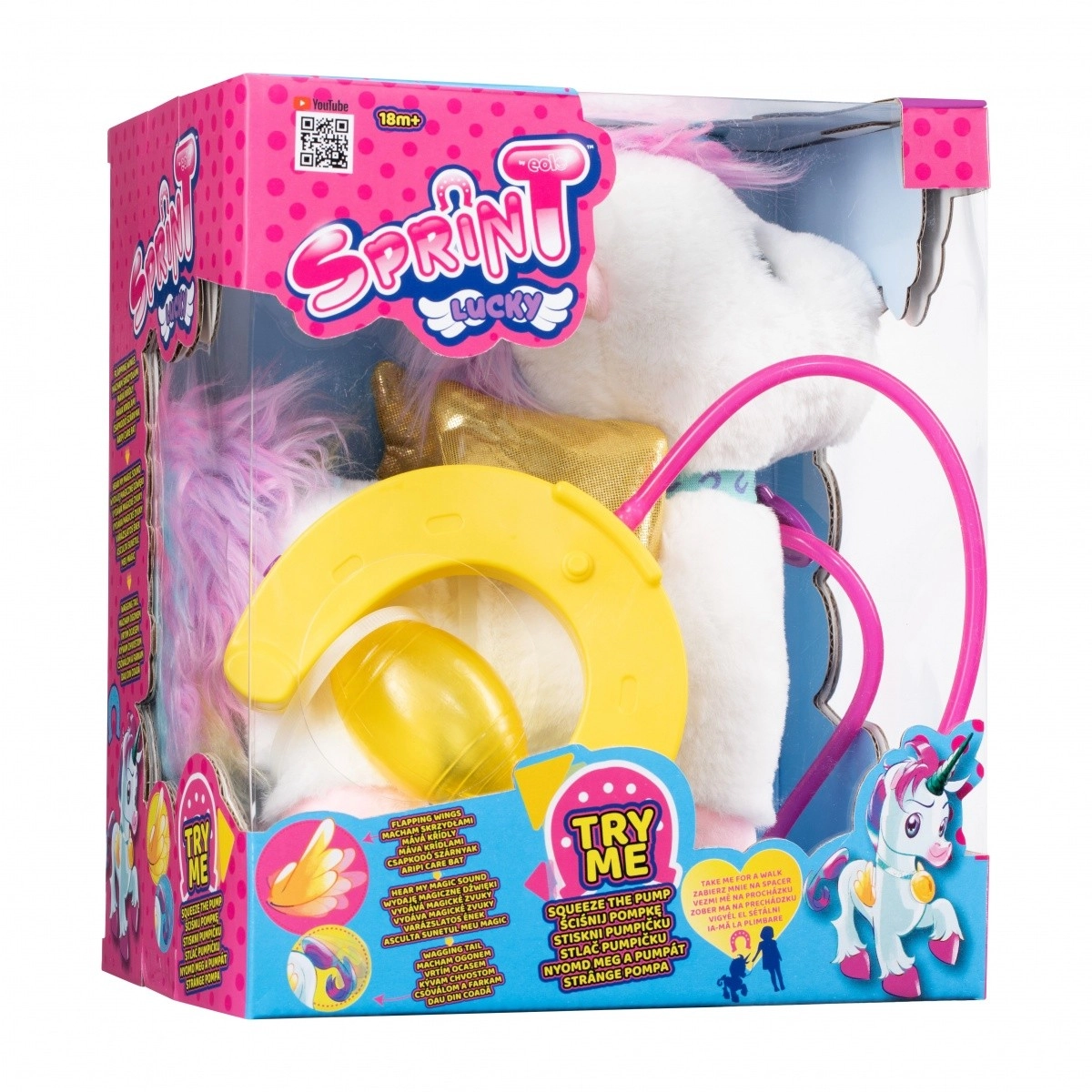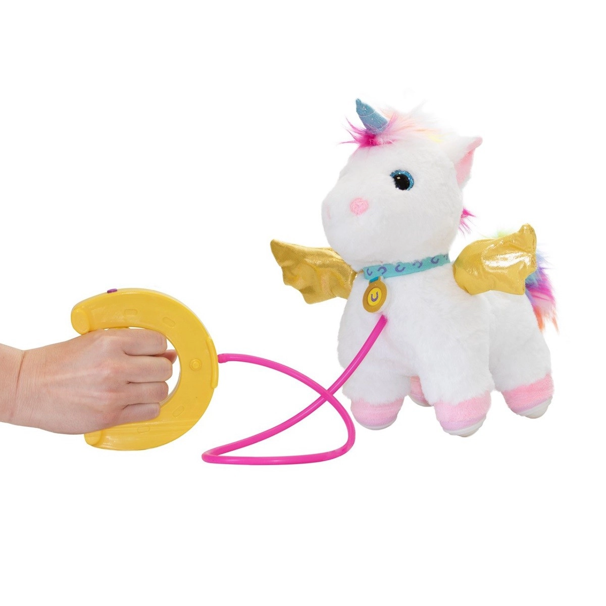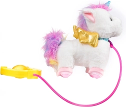 De schattige interactieve eenhoorn Lucky maakt elk kind blij – pak gewoon het lijntje en de knuffel loopt met je mee. Hij heeft stabiele pootjes met speciale bolletjes voor een zekere stand, ook als jongere kinderen spelen. De geïntegreerde luchtpomp in de lijn blaast de oren en staart op, en een door beweging geactiveerde geluidschip zorgt voor nog meer speelplezier.