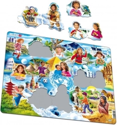 Ga op reis over de continenten met de LARSEN-puzzel, waar kinderen kennismaken met vriendjes uit Egypte, Duitsland, Italië, China en andere landen. Dankzij de onregelmatige stukjes zonder klassieke puzzelsluitingen is het leggen intuïtief en leuk – alsof de afbeelding in unieke delen is “gebarsten”.