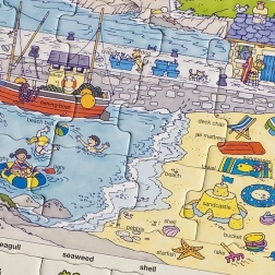 Ontdek wat je allemaal op het strand kunt vinden en leer watersporten benoemen met deze leuke puzzel. Elk stukje staat voor een ander woord dat aan de juiste afbeelding aan de rand van de puzzel moet worden gekoppeld. De puzzel bevat 18 stukjes in het midden, die samen een complete scène vormen met leervoorbeeldwoorden in het Engels. Kinderen kunnen de woorden in de afbeelding opzoeken voor beter begrip.