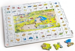 Larsen Puzzel Engels is vooral voor wie graag op een speelse manier leert. Op de weide buiten het dorp of bij de vijver kun je verschillende personages en voorwerpen ontdekken die nodig zijn voor kamperen. Bij de alfabetisch geordende Engelse woorden aan de rand van de puzzel horen stukjes met de bijbehorende afbeelding.