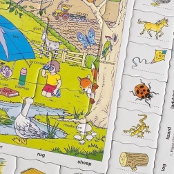 In het midden van de puzzel bevinden zich 18 klassieke stukjes met een complete scène, inclusief educatieve woordjes en hun Engelse benaming. Elk stukje heeft een unieke vorm, wat betekent dat je de puzzel alleen kunt leggen wanneer alle stukjes op de juiste plaats zitten. Een stevige rand maakt het leggen makkelijker en openingen aan de onderzijde maken het eenvoudig om stukjes eruit te halen.