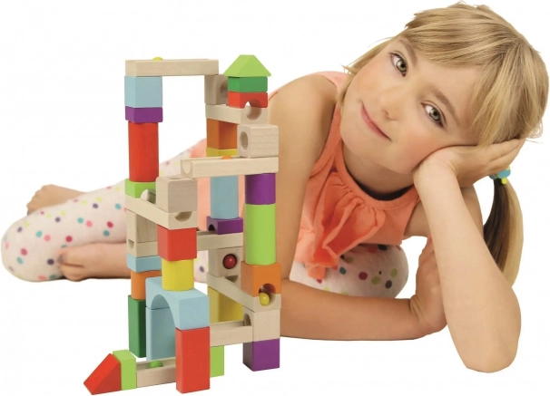 De set van gekleurde houten blokken en banen biedt eindeloze mogelijkheden voor het bouwen van banen, terwijl het de fijne motoriek en creativiteit ontwikkelt.